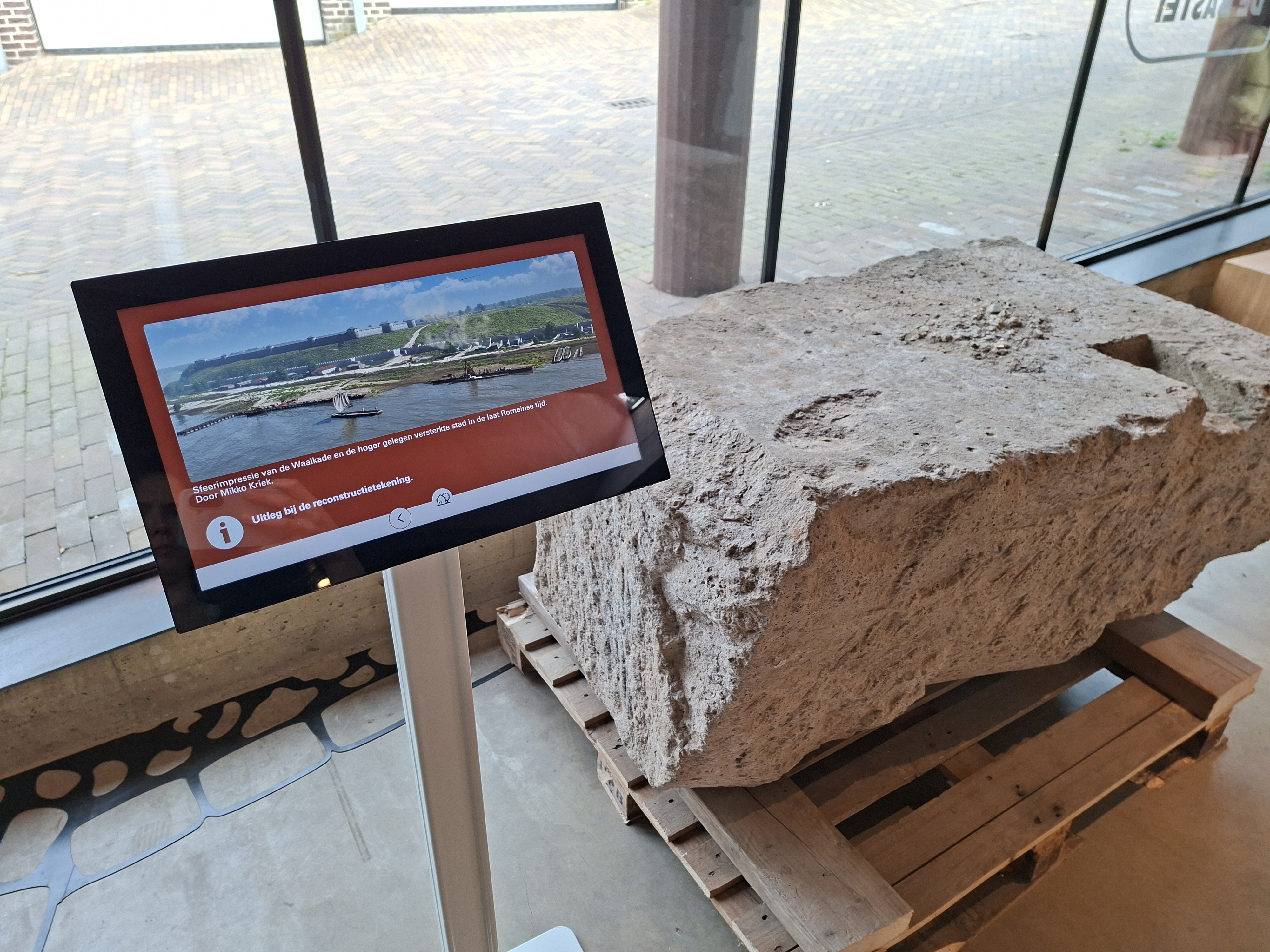 De eerste fase van de presentatie is gerealiseerd; De eerste fase is nu gerealiseerd; met een metalen print zijn de contouren van de muur op de vloer van het entreegebouw te bewonderen. Daarnaast maakte Mikko Kriek een overtuigende visualisatie van de muur en poort gezien vanaf de Waal in de laat-Romeinse tijd. De volgende fase is een passende presentatie van de poort.